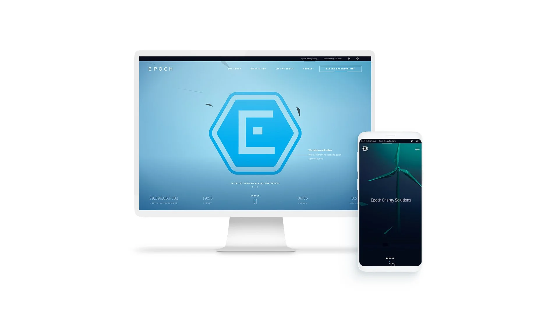 Epoch have offices in London, New York and Sydney and they wanted to communicate their position as an international trader. We worked with the developer to produce a website that would change appearance throughout the 24h day depending on your location. The website colour scheme would change from day - night and would replicate sunrises and sunsets using realtime data.